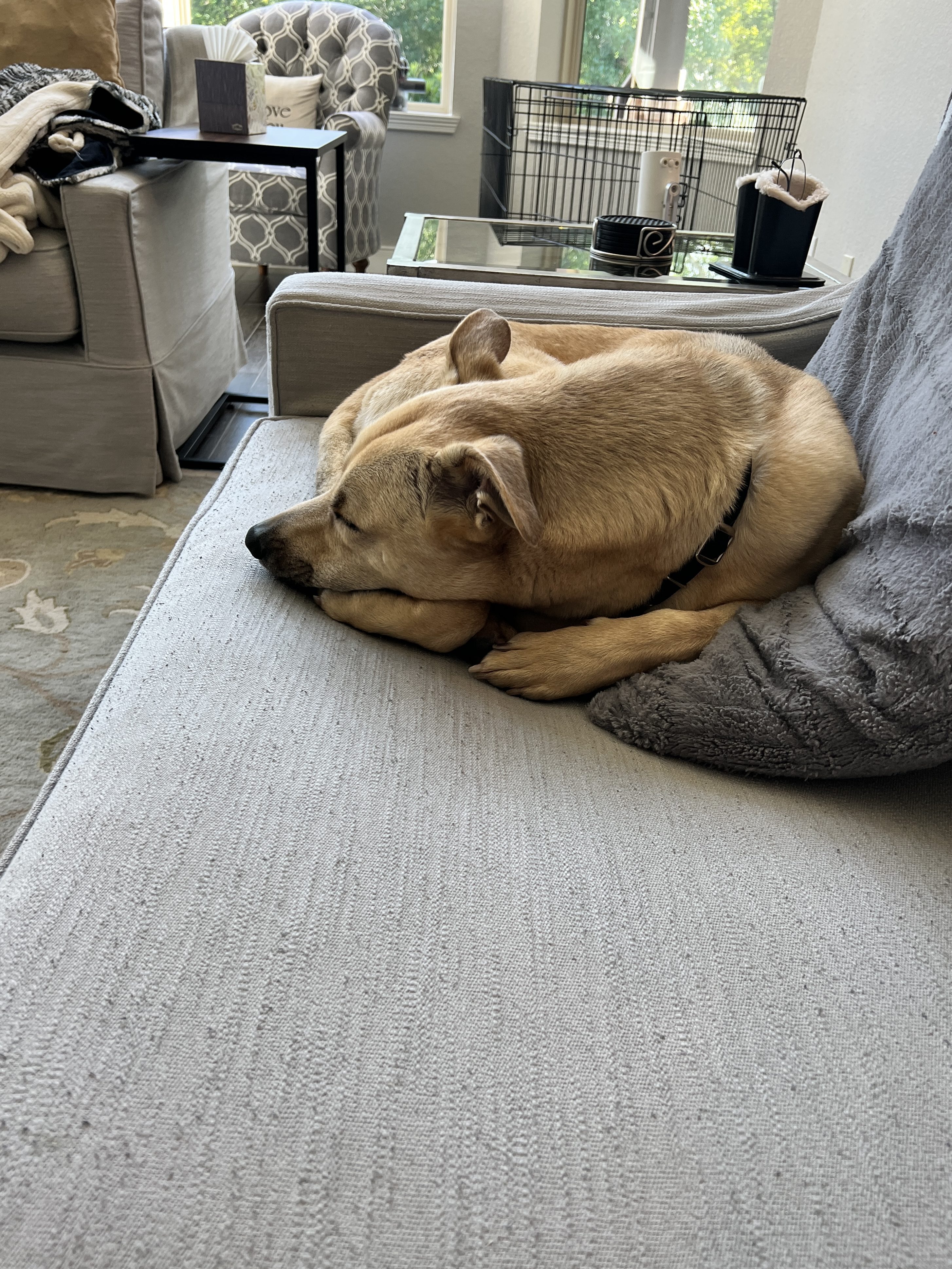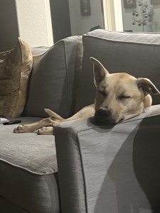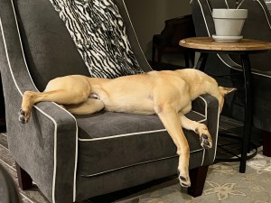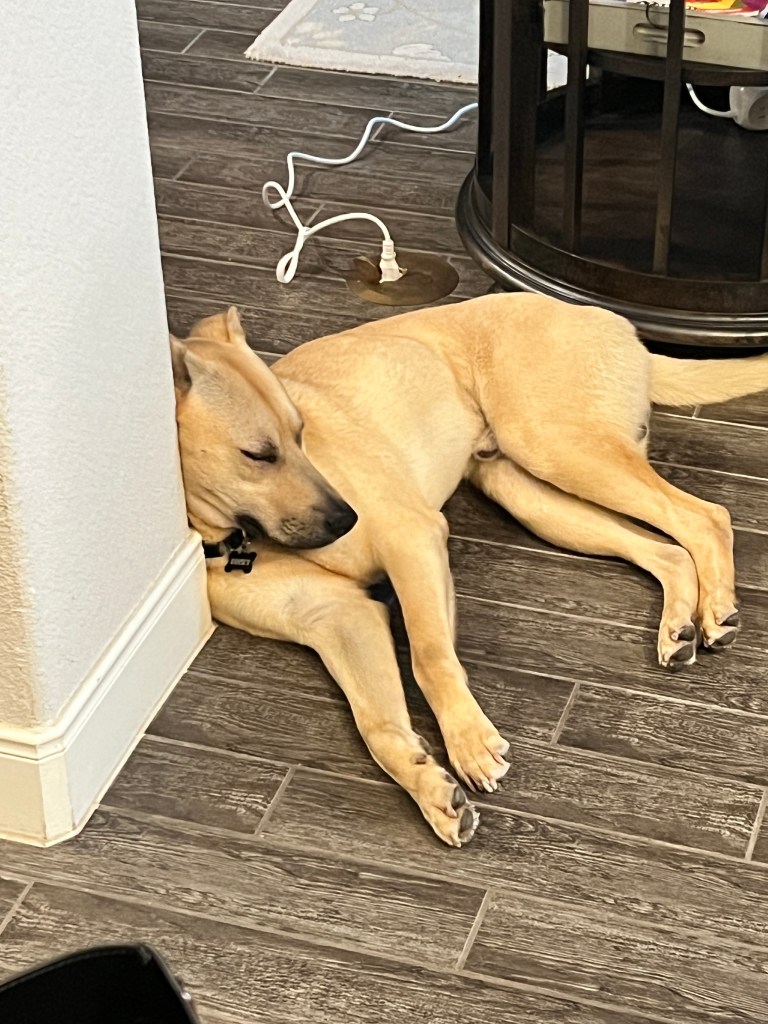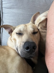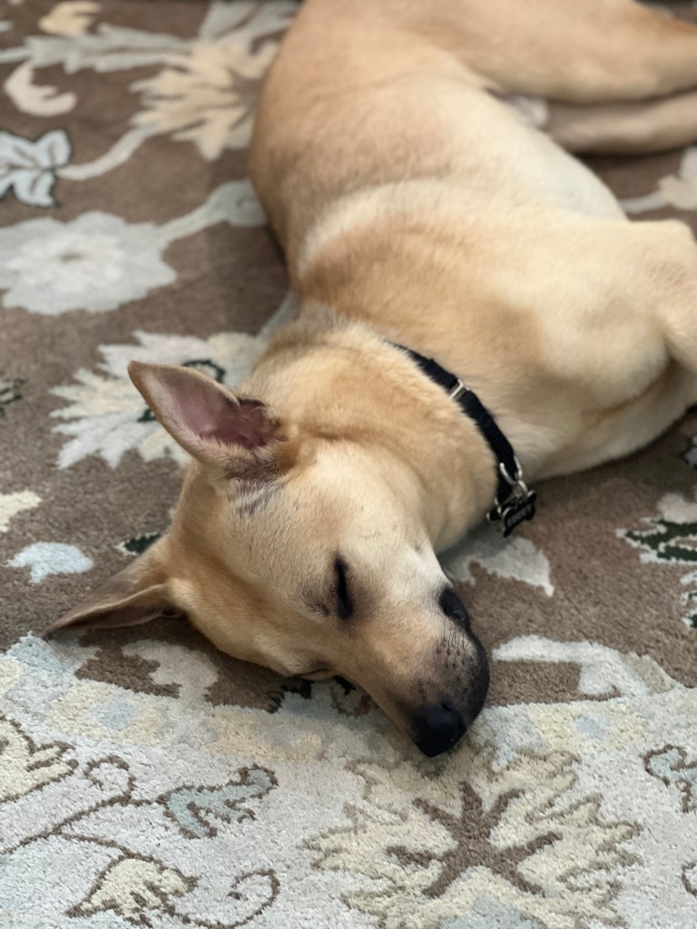 He really is a mighty good dog. He sleeps so well in his crate — I woke up at 5:45 this morning (Saturday) to wake up my son for work, then came back and laid on the couch. He had zero interest in getting up and went back to sleep in his crate. That’s my kind of dog!